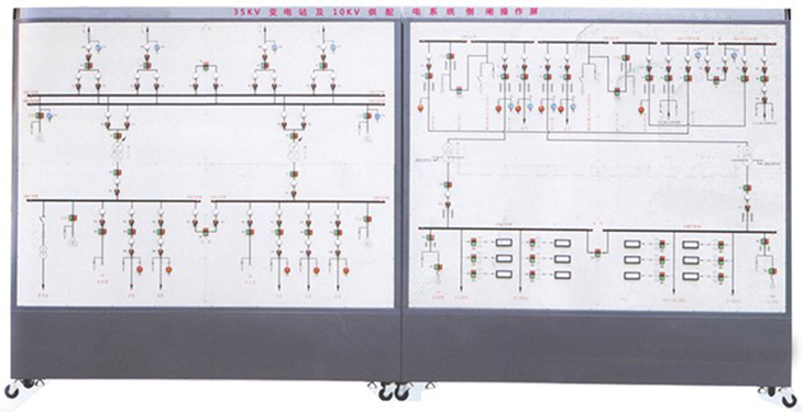 "35kV變電站及10kV供配電系統(tǒng)倒閘操作屏"是針對變電站倒閘操作而專門研制的實訓裝置。本系統(tǒng)含35kV、10kV和0.4kV三個電壓等級:35kV具有4路進線,雙母帶聯(lián)絡(luò);10kV側(cè)采用單母分段,兩入兩出,環(huán)網(wǎng)供電;0.4kV側(cè)采用單母分段,并具有備用發(fā)電系統(tǒng)。在此典型35kV變電站模型上,學生可以進行各種工況下的倒閘操作。變電站的電壓等級和結(jié)線方式也可以根據(jù)用戶要求設(shè)計。因此本裝置適合各類職業(yè)院校供配電類、電力公司、職業(yè)技能培訓部門等機構(gòu)的培訓、考核。