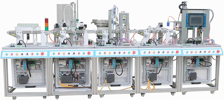 1.模擬工業(yè)藥劑生產(chǎn)裝配流程,共包含5個(gè)工作站,可單站、可組合靈活搭配;模塊化的設(shè)計(jì),可以模塊裝調(diào),位置靈活調(diào)整,每站各有一套PLC控制系統(tǒng)獨(dú)立控制,在單個(gè)培訓(xùn)完成以后,又可以將相鄰的兩站連在一起,學(xué)習(xí)復(fù)雜系統(tǒng)的設(shè)計(jì)、安裝、編程、調(diào)試和整機(jī)運(yùn)行。