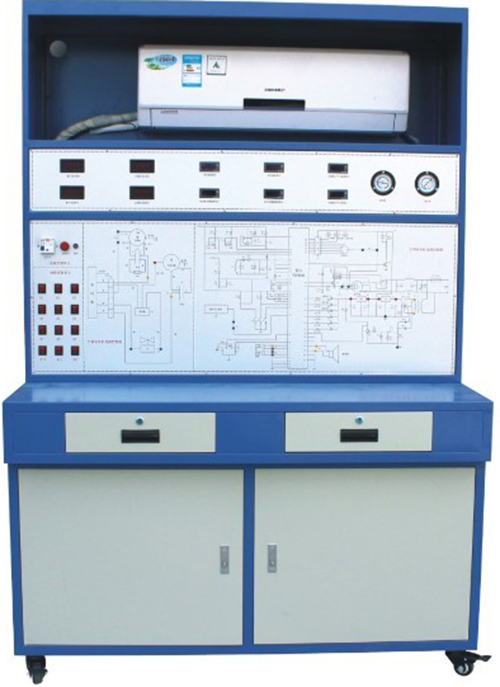 裝置直觀展示了變頻空調(diào)的系統(tǒng)結構和工作原理,便于教學演示講解及學生對課本知識的理解掌握。配置的交流電壓表、交流電流表、溫度表、真空壓力表以及相應的信號指示燈,使整個變頻空調(diào)系統(tǒng)的實時工作狀態(tài)一目了然;主面板中間印有電氣控制系統(tǒng)原理圖,并設有相應測試點;屏背面可觀察到整個制冷系統(tǒng)結構原理以及主要部件的實際物體,相應部件均有名稱標識;并設有視液鏡,可觀察制冷劑狀態(tài)。