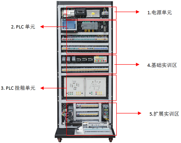 實訓單元組成:網孔板實訓區(qū)主要由電源單元、PLC單元、PLC學習箱單元、基礎實訓單元、小車運動單元、變頻器單元等組成。