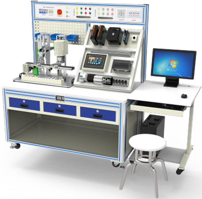 機電一體化實訓(xùn)工作站包含實訓(xùn)平臺、控制掛板、應(yīng)用模塊、電腦桌、圓凳三部分組成,實訓(xùn)平臺采用優(yōu)質(zhì)鋁型材做骨架,鋁型材立柱與實訓(xùn)桌面連接。左右兩側(cè)及后面封裝優(yōu)質(zhì)鋼板,正面設(shè)計儲物柜與抽屜。