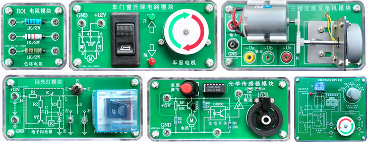 汽車電工電子實訓模塊由透明封閉元件盒及PCB板構成。元件盒體由透明有機工程塑料注塑而成,具有示教功能,使用者能夠觀察到元件形狀和接線方式,有利于教師講解和學生認識;面板采用PCB制作而成,表面清爽、符號線路清晰、元件更換容易。