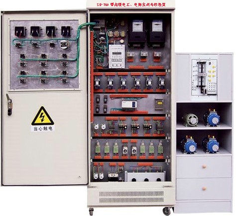 該裝置按標(biāo)準(zhǔn)電氣控制柜設(shè)計制造規(guī)格,充分利用雙面位置,柜內(nèi)裝有完成各種照明電路所需的單相電度表、日光燈、單聯(lián)開關(guān)、插座、感應(yīng)開關(guān)、漏電開關(guān)等,以及電氣控制所需要的多種低壓電器,如漏電斷路器、熔斷器、電流互感器、交流接觸器、時間繼電器、熱繼電器、中間繼電器、行程開關(guān)、按鈕、信號燈、轉(zhuǎn)換開關(guān)、電壓表、電流表、功率表及電度表等,為了延長電器使用壽命,各電器的接點都與接線端子相連,再由接線端子與被控制電氣連接。