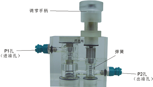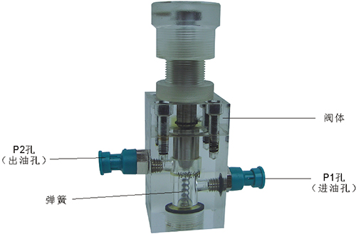 2、溢流閥結(jié)構(gòu)上參考了國(guó)產(chǎn)P-63B型低壓直動(dòng)式溢流閥,其閥體閥蓋、鎖緊螺母、調(diào)節(jié)螺母、螺塞等采用了進(jìn)口透明有機(jī)玻璃材料精制而成,閥芯、調(diào)節(jié)桿采用了45#中碳鋼材料。并配合彈簧,油接頭,密封圈等標(biāo)準(zhǔn)件裝配而成,通過(guò)它可明確地觀察到閥芯、彈簧、油孔等結(jié)構(gòu)及其運(yùn)行過(guò)程,具有形象逼真,性能可靠等優(yōu)點(diǎn)。它即可作為教學(xué)模型,也可以作為液壓實(shí)驗(yàn)元件進(jìn)行實(shí)驗(yàn)演示。