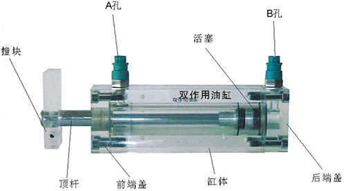 2、雙作用油缸的缸體,端蓋,行程撞塊,撞塊支承等均采用了進(jìn)口透明有機(jī)玻璃材料。頂桿采用了45#中碳鋼,并配合油接頭,密封圈,內(nèi)六角螺絲等標(biāo)準(zhǔn)件精制而成。能通過(guò)它明確地觀察活塞、頂桿、油封、油孔等結(jié)構(gòu)及其運(yùn)行過(guò)程。