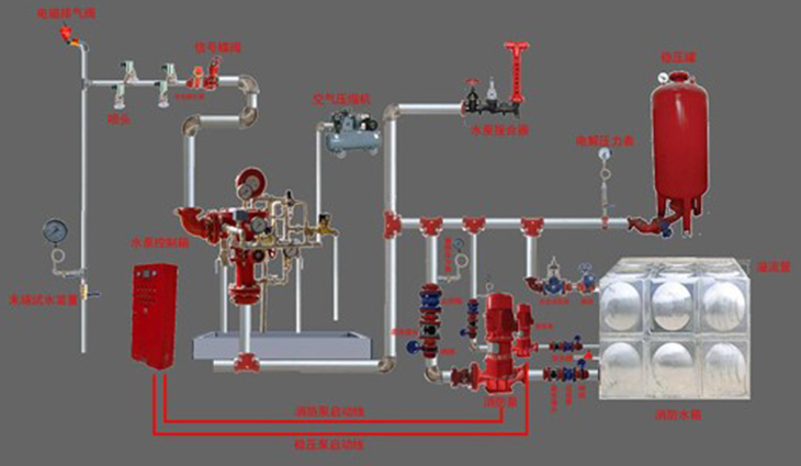 預(yù)作用系統(tǒng)是將火災(zāi)自動探測報警技術(shù)和自動噴水滅火系統(tǒng)有機(jī)地結(jié)合起來,對保護(hù)對象起了雙重保護(hù)作用。預(yù)作用系統(tǒng)由閉式噴頭、管道系統(tǒng)、雨淋閥、濕式閥、火災(zāi)探測器、報警控制裝置、充氣設(shè)備、控制組件和供水設(shè)施部件組成。這種系統(tǒng)平時呈干式,在火災(zāi)發(fā)生時能實現(xiàn)對火災(zāi)的初期報警,并立刻使管網(wǎng)充水將系統(tǒng)轉(zhuǎn)變?yōu)闈袷。系統(tǒng)的這種轉(zhuǎn)變過程包含著預(yù)備動作的功能,故稱為預(yù)作用噴水滅火系統(tǒng)。