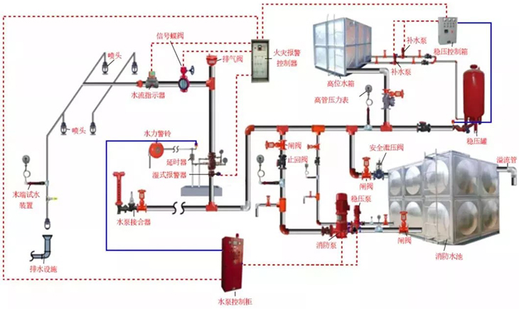 消防泵、穩(wěn)壓泵、氣壓罐、閘閥、消防水箱、水泵控制電箱、管網(wǎng)壓力表、電接點(diǎn)壓力表、泄壓閥、柔性接頭、過濾器、泄水閥、DN100鍍鋅管、濕式報警閥組、干式閥組、預(yù)作用閥組、雨淋閥組、末端試水裝置、各種噴頭、信號蝶閥、水指、排氣閥、末端試水箱 |