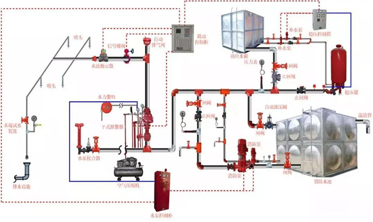 干式系統(tǒng)的基本構(gòu)成條件包括水源、加壓與穩(wěn)壓設(shè)施、壓力氣源、報警裝置、管網(wǎng)及閉式噴頭等部分。