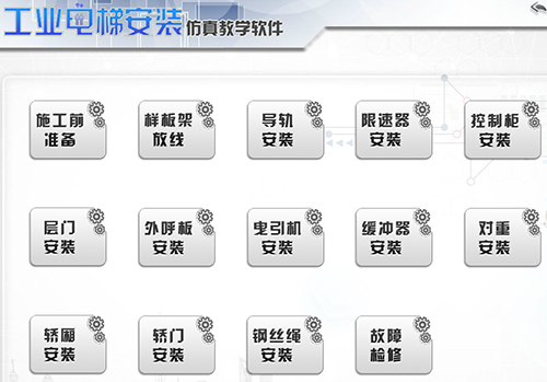 電梯模型:包含驅(qū)動(dòng)裝置、轎廂及對(duì)重裝置、導(dǎo)向系統(tǒng)、門(mén)機(jī)機(jī)構(gòu)、安全保護(hù)機(jī)構(gòu)等組成。驅(qū)動(dòng)裝置由曳引機(jī)(帶有制動(dòng)器、減速機(jī)、導(dǎo)向輪、工業(yè)編碼器)、曳引鋼絲繩和繩頭組合等部件組成;導(dǎo)向系統(tǒng)由井道鋼架、導(dǎo)軌、導(dǎo)靴等組成;門(mén)機(jī)機(jī)構(gòu)由轎門(mén)、層門(mén)、開(kāi)關(guān)門(mén)機(jī)構(gòu)、安全觸板、門(mén)套等部件組成;安全保護(hù)機(jī)構(gòu)由超載裝置、緩沖器、安全鉗、限速保護(hù)裝置等部件組成。