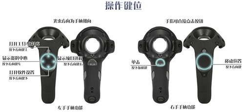 工業(yè)電梯安裝VR實(shí)訓(xùn)系統(tǒng)中所有交互均采用虛擬現(xiàn)實(shí)頭顯和手柄完成。其中頭顯的主要功能是控制場(chǎng)景中人物的位置和屏幕顯示的方向,手柄的主要功能包括與界面交互的"扳機(jī)建"、移動(dòng)手柄進(jìn)行觸碰、左手點(diǎn)擊輪盤(pán)進(jìn)行呼出和移動(dòng)功能鍵。