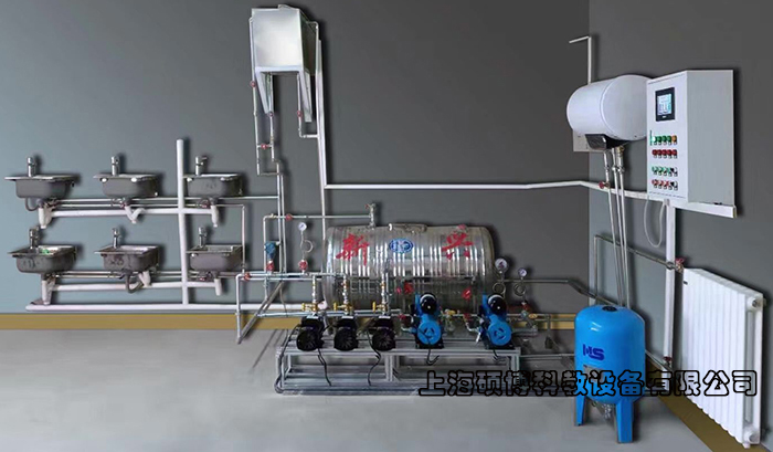 1、生活給水系統(tǒng):主要有給水箱、給水泵、給水管道、壓力變送器、脈沖水表、水龍頭和淋浴頭等組成。管路采用不銹鋼管進行設計,可進行不銹鋼管的切割、安裝和通水試驗操作,通過控制系統(tǒng)可實現生活給水系統(tǒng)的變頻恒壓供水功能,實現單泵變頻控制或雙泵切換控制等功能;通過脈沖式水表可以完成用水量的計量。