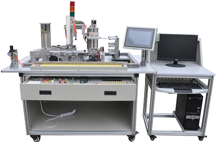 該系統(tǒng)由型材實(shí)訓(xùn)臺(tái)、輥道傳送上料裝置、自動(dòng)擺臺(tái)單元、雙工位井式上料裝置、搬運(yùn)裝配機(jī)械手、加工單元、搬運(yùn)堆垛裝置、電源模塊、按鈕模塊、PLC模塊、變頻器模塊、各種傳感器、警示燈、電磁閥和I/O接口板等組成,完成工件上料、檢測(cè)、搬運(yùn)、加工、裝配、分揀、堆垛入庫(kù)等功能。整體結(jié)構(gòu)采用開(kāi)放式和拆裝式設(shè)計(jì),學(xué)生可以對(duì)各零件、部件、單元、直至整體機(jī)構(gòu)進(jìn)行零部件拆裝、調(diào)試、運(yùn)行。