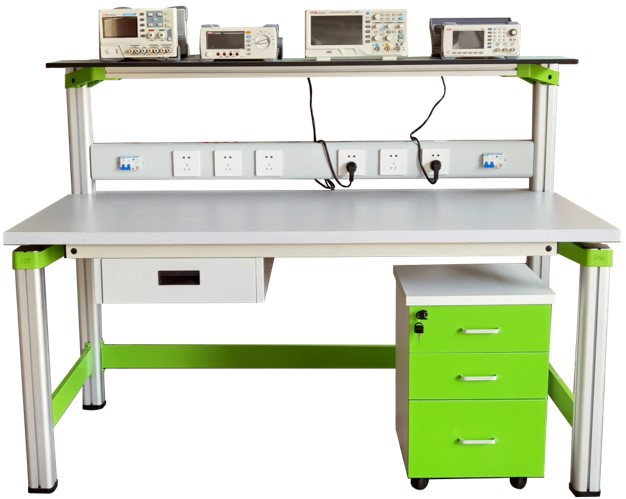 實訓桌規(guī)格為1600(長)*700(寬)*1150(高),設(shè)有一個抽屜;實驗桌主體結(jié)構(gòu)全部采用高性能表面氧化的鋁型材及一次成型鋁壓鑄框架連接構(gòu)件,連接構(gòu)件采用壓鑄成型工藝(非焊接工藝),經(jīng)機加工、拋丸、噴砂,表面靜電噴涂工藝,安裝方便、快捷,用戶可自行DIY組裝。桌體立柱采用工業(yè)鋁型材成型工藝,表面氧化處理,截面尺寸:70mm×70mm,四面帶槽,槽寬約8mm,端部裝有注塑成型配套塑料堵頭。桌面采用25mmE1級三聚氰胺飾面板,桌面板下設(shè)支撐框架,承受力不少于300kg。配備儲存柜,存放元件及工具,儲存柜底部4只高強度萬向可制動PU腳輪,方便移動。實訓裝置整體簡約不簡單,高端大氣,符合現(xiàn)代化產(chǎn)品審美和發(fā)展趨勢。