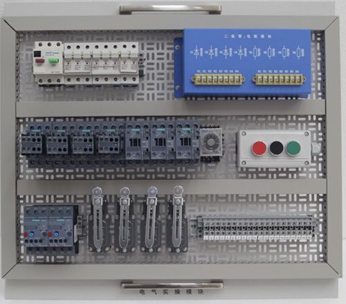 1)采用厚網(wǎng)孔板,工業(yè)灰噴塑,面板安裝一線品牌的電器元件(空氣開關(guān)、熔斷器、交流接觸器、時(shí)間繼電器、熱繼電器、按鈕、指示燈、接線端子等)。實(shí)操模塊具有快速拆裝等優(yōu)點(diǎn),與實(shí)訓(xùn)臺桌面具有一定角度安裝,符合人體視覺。可以滿足電工(中級、高級)、機(jī)電考核、技能鑒定等功能。