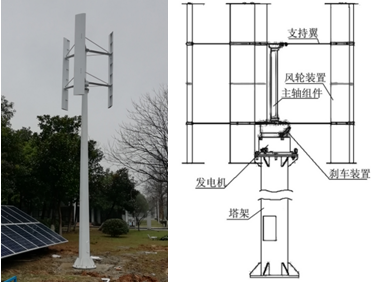 風(fēng)力發(fā)電系統(tǒng)由一臺(tái)2KW垂直軸風(fēng)力發(fā)電機(jī)組、葉片、風(fēng)機(jī)控制器塔架等組成。