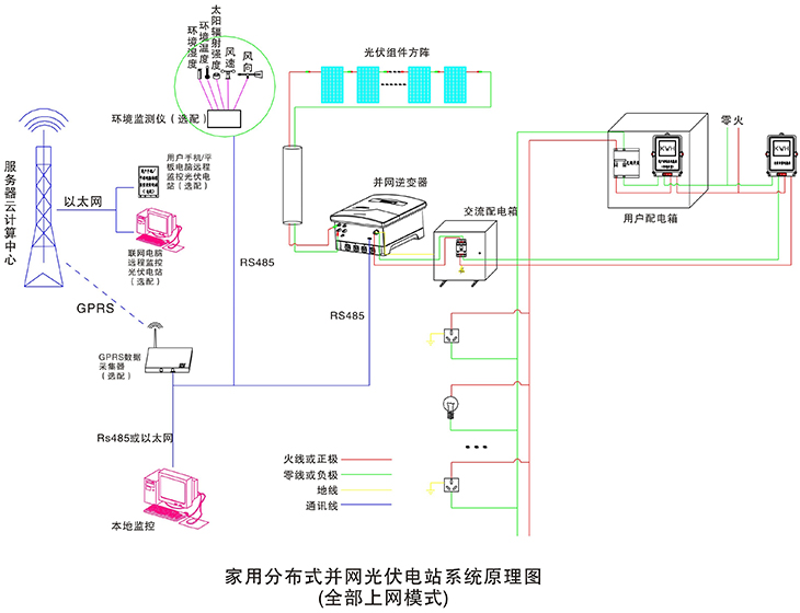 在晴朗的白天,裝在屋頂上的光伏組件發(fā)出的直流電經(jīng)過并網(wǎng)逆變器逆變成與電網(wǎng)同頻率同相位的單相交流電給負載進行供電,在夜晚或陰雨天等太陽光照不足的情況下,系統(tǒng)處于待機狀態(tài),負載用電全部來自電網(wǎng)。您可以通過系統(tǒng)監(jiān)控軟件來實時查看系統(tǒng)的運行狀態(tài)和故障信息,或者是選配遠程通訊數(shù)據(jù)采集器,將系統(tǒng)工作數(shù)據(jù)通過GPRS或以太網(wǎng),傳輸?shù)侥氖謾C、平板電腦或任意一臺聯(lián)網(wǎng)的電腦,以便于您遠程實時掌控電站的信息。