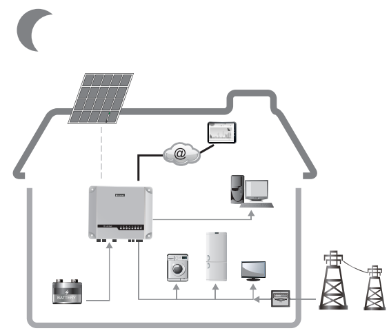 Ø 夜晚,光伏側(cè)直流停機(jī),由儲(chǔ)能電池通過(guò)儲(chǔ)能逆變器單獨(dú)給負(fù)載供電,當(dāng)電池剩余容量(SOC)放到設(shè)定值,系統(tǒng)自動(dòng)切入電網(wǎng),由電網(wǎng)給負(fù)載供電,根據(jù)需求,電網(wǎng)可以通過(guò)儲(chǔ)能逆變器給電池充電,也可以不充電;