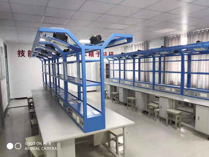 實(shí)訓(xùn)臺(tái)上提供日光燈(用于照明)2個(gè),透明的PVC板4個(gè),可夾放原理圖等資料,另外還配備三芯雙聯(lián)暗插座4個(gè)、兩芯暗插座2個(gè)、工具柜2個(gè),工作臺(tái)面設(shè)有綠色防靜電桌墊,整個(gè)裝配線安全可靠。