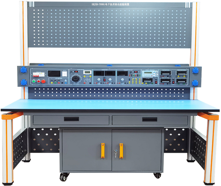 電子技術綜合實驗臺主要由實驗主機箱、儀器架、電源控制箱、獨立實驗電路模塊、實驗桌(含磁吸式實驗基座)、儲存柜、學生凳等組成。