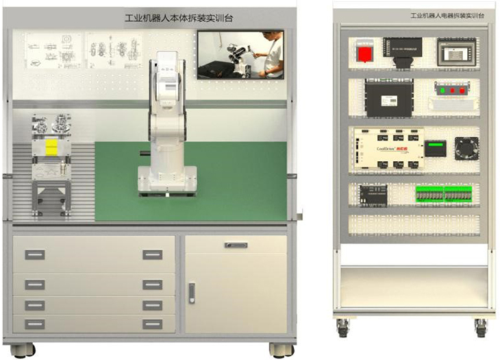 把工業(yè)級(jí)的機(jī)器人電氣柜的大部件拆散安裝在網(wǎng)孔架上,清晰體現(xiàn)機(jī)器人電氣連接原理。