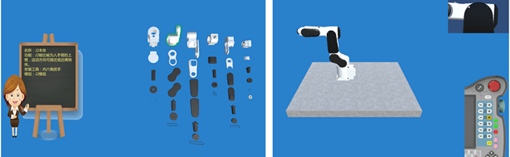 按真實(shí)工業(yè)機(jī)器人1:1開(kāi)發(fā)的虛擬仿真拆裝機(jī)器人,方便學(xué)生在電腦上反復(fù)練習(xí)而會(huì)損壞硬件。三維仿真軟件"學(xué)、練、考"對(duì)由學(xué)生自主學(xué)習(xí),并自動(dòng)考核。
