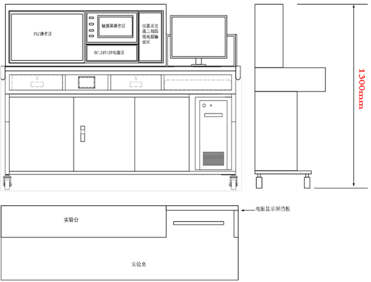 采用鋁木結(jié)構(gòu)實訓(xùn)臺,實訓(xùn)臺架由實訓(xùn)臺、實訓(xùn)桌、便攜式模塊、臺式電腦四大部分組成。實訓(xùn)臺包括PLC操作區(qū)、觸摸屏操作區(qū)、直流電源輸出區(qū)、交流電源總電源控制保護和交流三相四線電源輸出區(qū);實訓(xùn)桌以經(jīng)氧化處理的高材質(zhì)鈑金作為設(shè)備主要框架材料,桌身分上下兩層,上層由三個活動抽屜和一個鍵盤托板組成,下層左側(cè)為推拉式儲物柜,可存放工具材料、元器件等,右側(cè)部分空間可用于放置電腦主機。