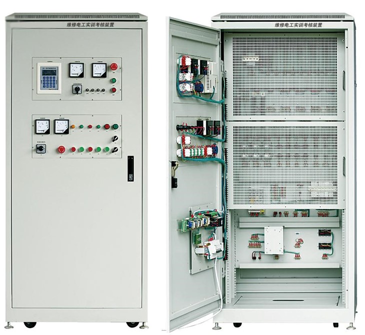 1、維修電工實(shí)訓(xùn)考核裝置采用標(biāo)準(zhǔn)配電柜為主體柜。實(shí)訓(xùn)用的各種控制元?dú)饧、走線(xiàn)槽、接線(xiàn)端子等器件,根據(jù)實(shí)訓(xùn)內(nèi)容學(xué)生自行布局安裝。