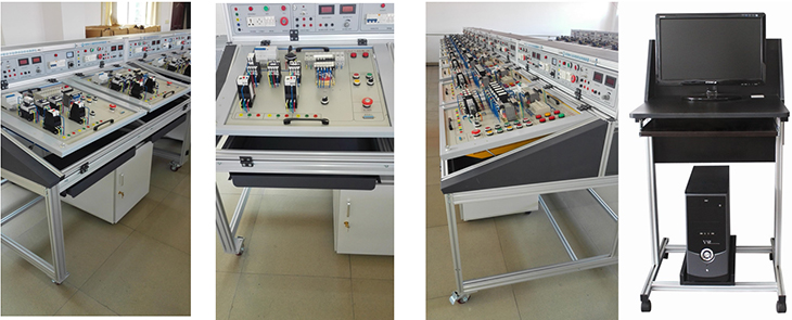 主控屏為鐵質(zhì)雙層亞光密紋噴塑結(jié)構(gòu),鋁質(zhì)面板。整個(gè)實(shí)訓(xùn)室配備一臺(tái)總電源控制柜,可以分控到下面每一臺(tái)設(shè)備的電源。
