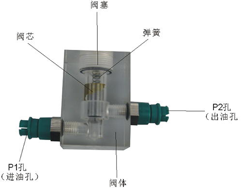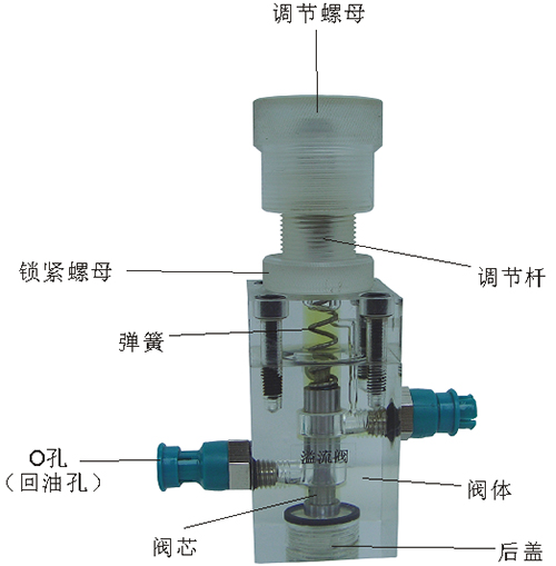 2、溢流閥結(jié)構(gòu)上參考了國產(chǎn)P-63B型低壓直動式溢流閥,其閥體閥蓋、鎖緊螺母、調(diào)節(jié)螺母、螺塞等采用了進口透明有機玻璃材料精制而成,閥芯、調(diào)節(jié)桿采用了45#中碳鋼材料。并配合彈簧,油接頭,密封圈等標(biāo)準(zhǔn)件裝配而成,通過它可明確地觀察到閥芯、彈簧、油孔等結(jié)構(gòu)及其運行過程,具有形象逼真,性能可靠等優(yōu)點。它即可作為教學(xué)模型,也可以作為液壓實驗元件進行實驗演示。