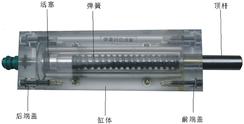 2、彈簧回位油缸的缸體,端蓋等均采用了進口透明有機玻璃材料精制而成,透明清晰,頂桿采用45#中碳鋼材料,并配合油接頭、密封圈、內(nèi)六角螺絲等標(biāo)準(zhǔn)件裝配而成,通過它可明確地觀察到活塞、頂桿、油封、油孔、彈簧等結(jié)構(gòu)及其運行過程,具有形象逼真,性能可靠等腰三角優(yōu)點,它即可作為教學(xué)模型,也可作為液壓實驗元件進行實驗演示。