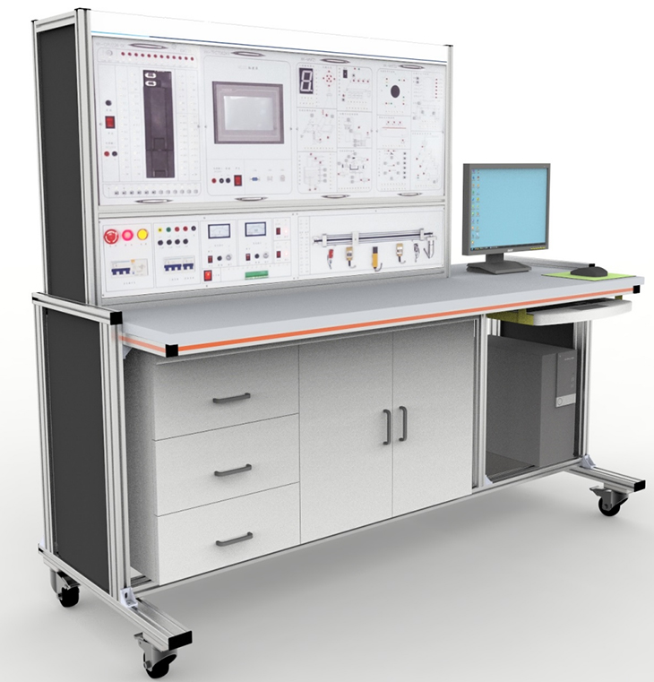2、臺架構成:實訓臺采用工業(yè)鋁型材加工。桌面下面放置儲物柜,左側有3層抽屜,用于存放工具以及實訓資料,右側為雙拉門式設計,可以放置實訓掛箱。底部裝有四個帶鎖止功能的萬向輪。柜體后下側留有電源輸入線。預留計算機放置位置。