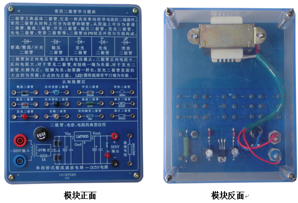 提供二極管、電容、電阻的綜合應(yīng)用電路:單相橋式整流濾波電路-DC5V電源的產(chǎn)生電路,帶有熔絲保護(hù)及發(fā)光二極管指示,通入單相AC220市電即可工作(模塊設(shè)有單相電源變壓器),同時(shí)該DC5V電源可為其他模塊檢測供電之用。