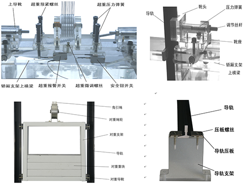 轎廂:12V風(fēng)扇 1只、220V照明燈 1只、門機(jī)裝置 1套、 安全鉗 2對、導(dǎo)靴 4套、超載裝置 1個、上(下)平層感應(yīng)器 2個、配重 1塊 |