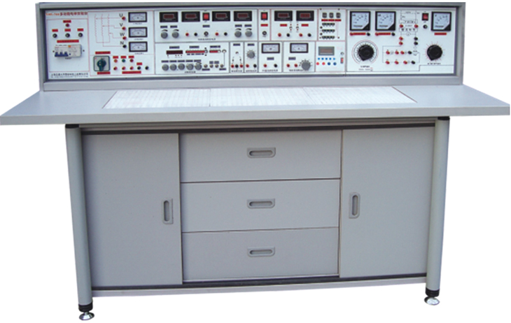 (一)實驗桌:學(xué)生實驗桌12張,一桌二座,實驗桌外形尺寸為160×70×80cm。桌子中央配置九孔電路插板,電路板注塑而成,表面布有九孔成一組相互聯(lián)通的插孔,元件盒在其上任意拼插成實驗電路。元件盒盒體透明直觀,內(nèi)裝電阻、電容、電感、二極管、三極管、場效應(yīng)管、可控硅等元件來完成原理實驗。內(nèi)裝元件一目了然,盒蓋印有永不褪色元件符號,線條清晰美觀。盒體與盒蓋采用較科學(xué)的壓卡式結(jié)構(gòu),維修、拆裝方便。繼電部分訓(xùn)練元器件已裝在特制的元件盒上,實訓(xùn)時插在九孔電路板上即可連線實驗,方便,靈活。模電、數(shù)電實訓(xùn)項目由二十幾套實訓(xùn)電路板和相應(yīng)元器件來完成。每張操作桌配有一粒膠皮板,保護通用電路板和桌面(如需要在桌上放置電動機、焊接等) 桌子下部是元器件儲存柜,放置實驗元件、器材、工具等。
