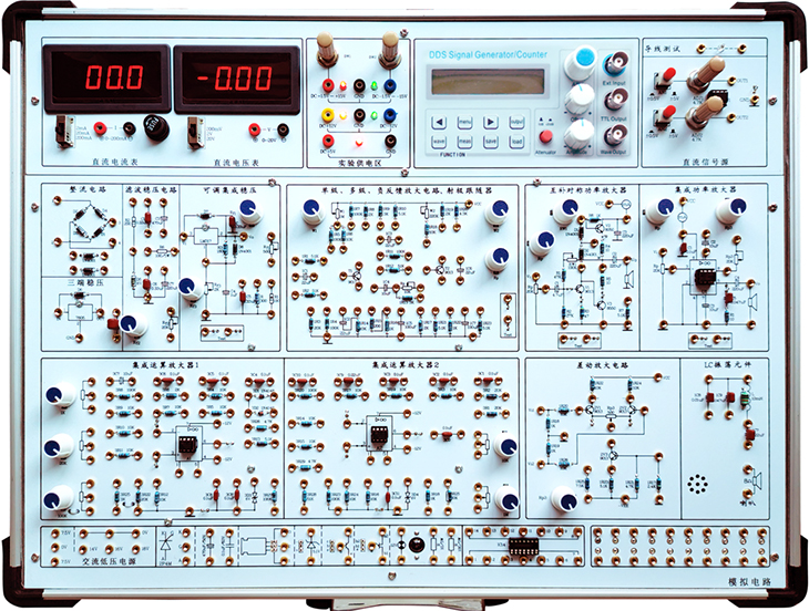 含機(jī)箱、工作電源、常用模擬信號源、實(shí)驗(yàn)電路區(qū)和分立元件 |
