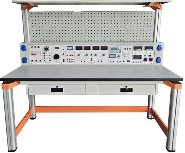 實訓桌后面二支截面尺寸70×70mm桌腳向上延伸,與一次成型鋁壓鑄框架連接構(gòu)件構(gòu)成(非焊接工藝)牢固的支架,與網(wǎng)孔工具掛板、儀器架、電源控制箱組成一個完整的實訓屏。