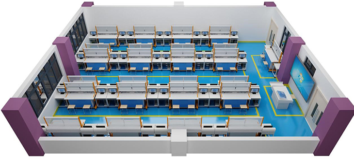 2、實(shí)訓(xùn)桌桌面采用25mm麻灰色高密度層壓板封邊特制,有效提高絕緣等級(jí);實(shí)驗(yàn)桌底部裝有至少4個(gè)導(dǎo)向輪,方便實(shí)訓(xùn)臺(tái)架移動(dòng);