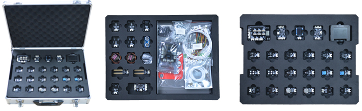 模塊包含LED燈模塊、按鍵模塊、RGB彩燈模塊、蜂鳴器模塊、人體感應(yīng)傳感器、光敏傳感器、溫度傳感器、濕度傳感器、OLED顯示模塊、模擬量傳感器、直流電機(jī)模塊、氣壓傳感器模塊等十五余種模塊、傳感器通過(guò)4P連接線連接到通用擴(kuò)展板。