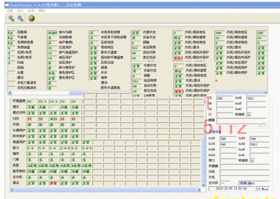 文本顯示界面:可測試壓縮機的運轉頻率,傳感器的各種數(shù)據,電子膨脹閥的工作步數(shù)等幾十種中央空調的工作數(shù)據和狀態(tài),