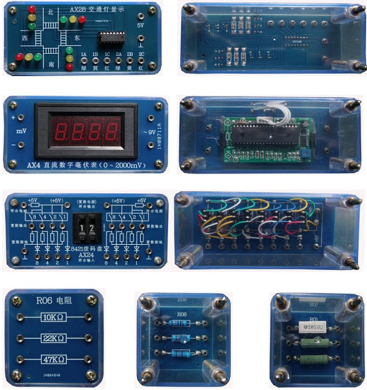 實(shí)訓(xùn)模塊由透明元件盒及PCB板構(gòu)成,元件盒是組合式透明元件盒,元件盒單元組采用多元件、典型實(shí)訓(xùn)單元電路、典型傳感器、通用集成電路插座等制成,可根據(jù)實(shí)訓(xùn)需要方便地組合成不同的電工電子實(shí)訓(xùn)線路;使實(shí)訓(xùn)具有開放性和創(chuàng)新性,元件盒體由透明有機(jī)工程塑料注塑而成,具有示教功能,使使用者能夠觀察到元件形狀和接線方式,有利于教師講解和學(xué)生認(rèn)識;面板采用PCB制作而成,表面清爽、符號線路清晰、表面耐磨損、元件更換容易;面板上標(biāo)志的元件電路符號采用最新國家標(biāo)準(zhǔn),具有整體結(jié)構(gòu)緊湊、外形美觀大方、安裝簡單、使用保管方便等特點(diǎn)。導(dǎo)線插孔采用防轉(zhuǎn)座,導(dǎo)線裝有彈性插頭可在模塊上面插接,以保證可靠連接進(jìn)行各種實(shí)訓(xùn);實(shí)訓(xùn)時可根據(jù)實(shí)訓(xùn)內(nèi)容和技能訓(xùn)練的需要,方便的任意組合實(shí)訓(xùn)線路,以完成不同的實(shí)訓(xùn)項(xiàng)目等。