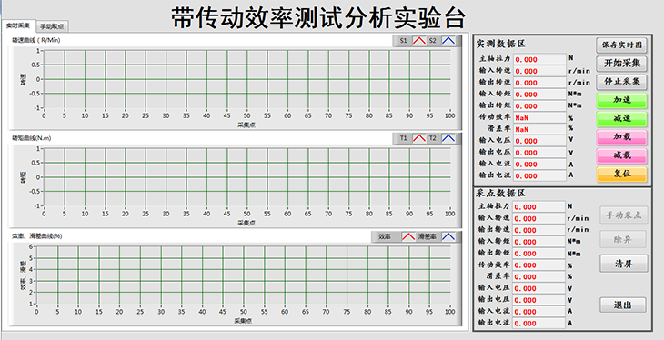 2、通過(guò)觸摸屏顯示面板顯示面板讀數(shù)進(jìn)行平皮帶傳動(dòng)效率的測(cè)定,人工繪制滑差曲線和效率曲線。
