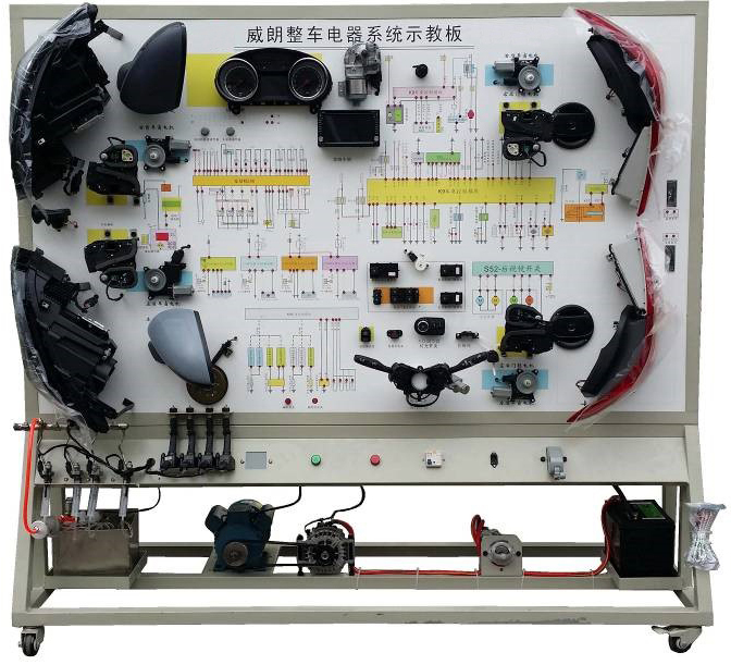 2.設(shè)備面板采用耐創(chuàng)擊、耐污染、防火、防潮的高級鋁塑板,表面經(jīng)特殊工藝噴涂底漆處理;面板打印有永不褪色的彩色電路圖;學(xué)員可直觀對照電路圖和實(shí)物,認(rèn)識(shí)和分析汽車整車電器各系統(tǒng)的工作原理。