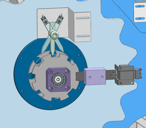 防逆轉(zhuǎn)裝置如下圖,裝置裝在扶梯上部驅(qū)動(dòng)位。在扶梯上行時(shí)凸輪順時(shí)針轉(zhuǎn)動(dòng),若扶梯發(fā)生異常情況而逆轉(zhuǎn)則凸輪逆轉(zhuǎn),此時(shí)打桿使限位開(kāi)關(guān)動(dòng)作并使扶梯主剎動(dòng)作從而使扶梯停止,反之亦然。同時(shí)此功能具備手動(dòng)測(cè)試操作功能。