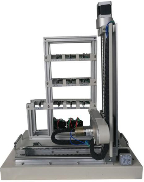 模型包含三層九倉(cāng)位庫(kù)體、出/入庫(kù)倉(cāng)位庫(kù)體、三維(X、Y、Z)運(yùn)動(dòng)機(jī)械及電氣控制等部分組成;定位執(zhí)行機(jī)構(gòu)由豎軸和橫軸組成;驅(qū)動(dòng)機(jī)構(gòu)由步進(jìn)電機(jī)及步進(jìn)電機(jī)驅(qū)動(dòng)器組成;傳動(dòng)軸為滾珠絲桿傳動(dòng)和雙軸導(dǎo)軌帶傳動(dòng),傳動(dòng)平穩(wěn)。取物軸由直流減速電機(jī)驅(qū)動(dòng),可實(shí)現(xiàn)前后兩方向的運(yùn)動(dòng)。