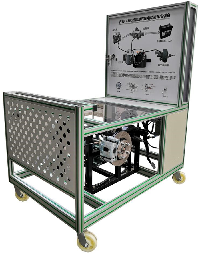 吉利EV450電動車電動真空泵(2件,1件解剖)、電動真空泵控制單元、真空壓力傳感器、剎車真空助力器、剎車總泵與踏板、剎車真空罐(2件,1件解剖)、剎車油瓶、開關(guān)電源12V30A、點火開關(guān)、真空表、壓力表(0~100kg/psi)、左右前輪液壓剎車盤總成、左右半軸總成、電機與變頻器(220V4KW1400轉(zhuǎn)電機,220V5KW變頻器)、電機傳動帶與輪盤一體化全鋁合金型材搭建的移動臺架(1500×1000×1700mm ,帶自鎖腳輪裝置,帶安裝檢測端子的原理面板948×898mm)、故障模擬與排除裝置、設(shè)備操作說明書。