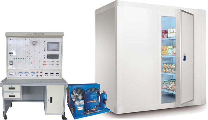 實(shí)訓(xùn)裝置主要由控制屏、實(shí)訓(xùn)桌、風(fēng)冷制冷機(jī)組及拼裝式冷庫(kù)等組成